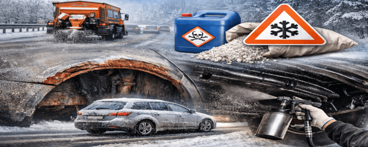 Современные противогололедные смеси содержат соли, щелочи и другие химические компоненты, которые ускоряют разрушение металла. Эти вещества оседают на кузове, колесных арках и днище автомобиля, постепенно проникая в микротрещины лакокрасочного покрытия.